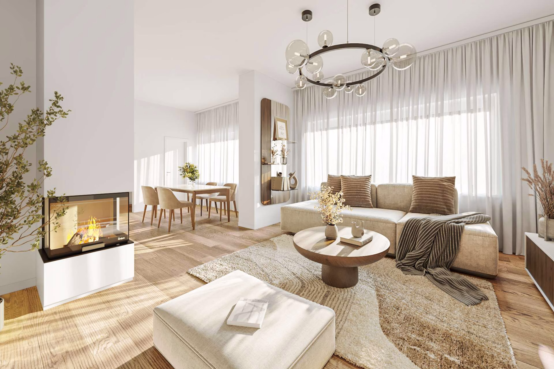 Das Erdgeschoss bietet ein großzügiges Wohnzimmer, zwei Schlafzimmer, Küche, Bad sowie Wintergarten und Terrasse mit direktem Zugang in den Garten.